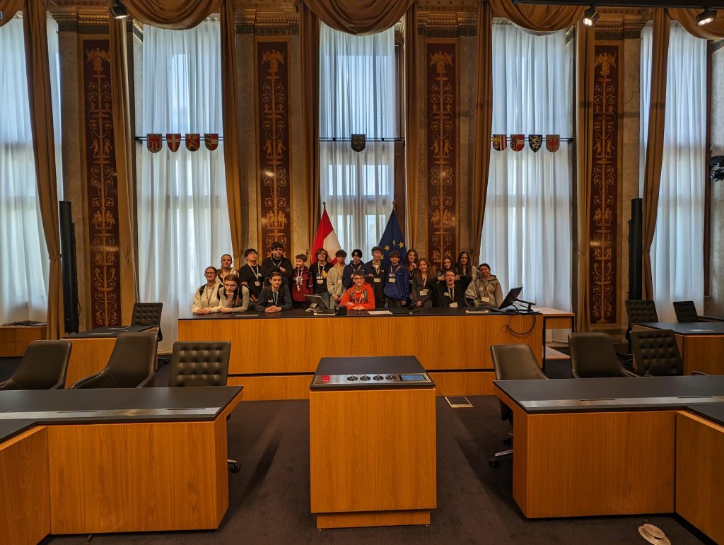 Das Thema hierbei war „Der Weg des Gesetzes“. Die Schülerinnen und Schüler wurden dabei an die wichtigen Mechanismen unserer Demokratie herangeführt, die dafür sorgen, dass Gesetze und Verordnungen beschlossen bzw. erlassen werden können. Dabei lernten sie nicht nur die einzelnen Schritte der Schaffung neuer Gesetze kennen, sondern hatten auch die Chance sich das Parlament selbst anzusehen. So wurde nicht nur der Plenarsaal bestaunt, sondern auch die Räumlichkeiten des Bundesrates, einer der Ausschüsse und sogar der historische Sitzungssaal konnten begutachtet werden.