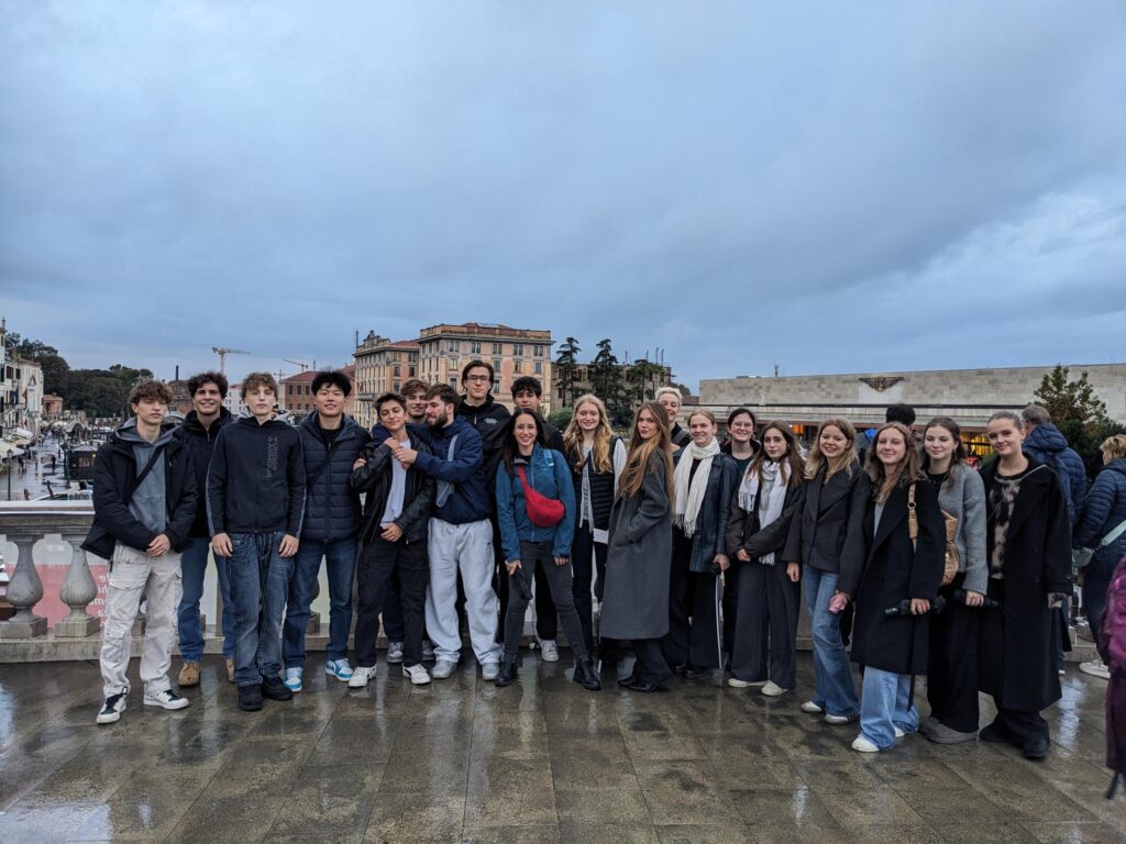 Vom 17. Bis zum 20. Oktober reisten wir, die Schülerinnen und Schüler der 8. Klassen, die „Kunst“ als alternatives Pflichtfach gewählt haben, in Begleitung von Frau Professorin Obernosterer und Herrn Professor Walcher nach Venedig. Wir starteten am 17. Oktober um 6 Uhr früh am Hauptbahnhof, um unsere Reise anzutreten und nutzen die lange Zugfahrt auch für vorbereitete Präsentationen. Nachdem wir ins A&O Hostel Mestre eingecheckt und spät zu Mittag gegessen hatten, kamen wir am späten Nachmittag in das „Innere“ der Lagunenstadt. Dort erkundeten wir zu Fuß die Gässchen und Brücken und gewannen so einen ersten Eindruck von der malerischen Stadt Venedig.