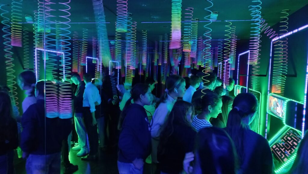 Dieses Motto klingt doch großartig! Die 4B hat sich Stressabbau als Thema für ihr diesjähriges Diversitätsprojekt gewählt. Auslöser für diese Idee war ein Lehrausgang ins „Ikono“-Museum am 9. Jänner 2025. In diesem interaktiven Museum kann man in jedem Raum eine spannende Szenerie erleben. Der Eingang führt durch einen Spaghetti-Vorhang und dann gibt es ein Labyrinth, mit Helium gefüllte Bälle zum Spielen und als absolutes Highlight ein riesiges Pool mit kleinen Bällen. In diesem Pool hat die 4B eine ganze Stunde gechillt. Dabei war zu beobachten, wie die Anspannung, die normalerweise den ganzen Schultag zu spüren ist, verschwand.