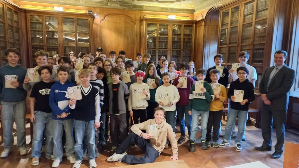 Der Elternverein hat dankenswerterweise alle Teilnehmerinnen und Teilnehmer mit einem Stück Schokolade beim Wettbewerb motiviert und allen Teams auf den ersten drei Plätzen in der Schulwertung ein kleines Geschenk finanziert, das gemeinsam mit einer Urkunde von Dir. Krischke bei der Siegerehrung übergeben wurde.