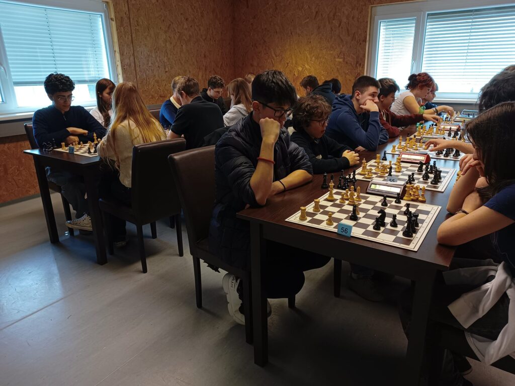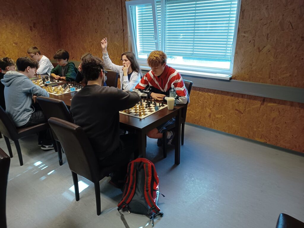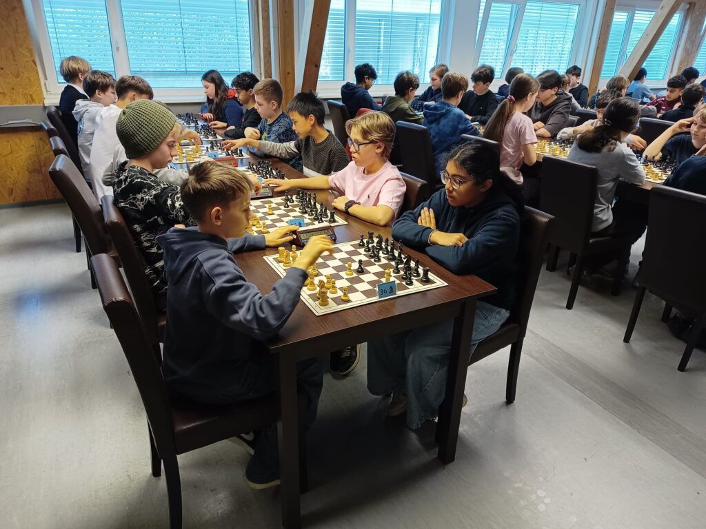 Kurz nach 9:00 Uhr war dann die erste von insgesamt sieben Auslosungen und jeder hatte sich an seinen zugewiesenen Tisch begeben. Man hatte 12 Minuten Bedenkzeit pro Partie (ohne Zeitaufschlag pro Zug) und es wurde immer abwechselnd Schwarz und Weiß gespielt. Die erste Runde verlief nicht sehr positiv für unser Team, da die allermeisten Spieler ohne Elo Zahl waren und deshalb zufällig verteilt wurden. Nach der ersten Runde war das Matchmaking dann deutlich ausgeglichener und auch wir haben immer mehr unserer Spiele für uns entscheiden können. Zwischen jeder Runde waren ca. 10 Minuten Pause, in der die nächste Runde ausgelost wurde. Ungefähr zur Halbzeit des Turniers sah es gar nicht so schlecht für uns aus und jeder hatte zumindest schon eine Partie gewonnen. Am Ende erreichten wir den 18. Platz von insgesamt 22 Teams. Am Vortag gab es dasselbe Format für die Unterstufe, wo ein respektabler 14 Platz (von insgesamt 29 Teams) von einem Team aus Erstklässlern erreicht wurde. Das Turnier selbst war eine erstaunlich lustige und interessante Erfahrung.